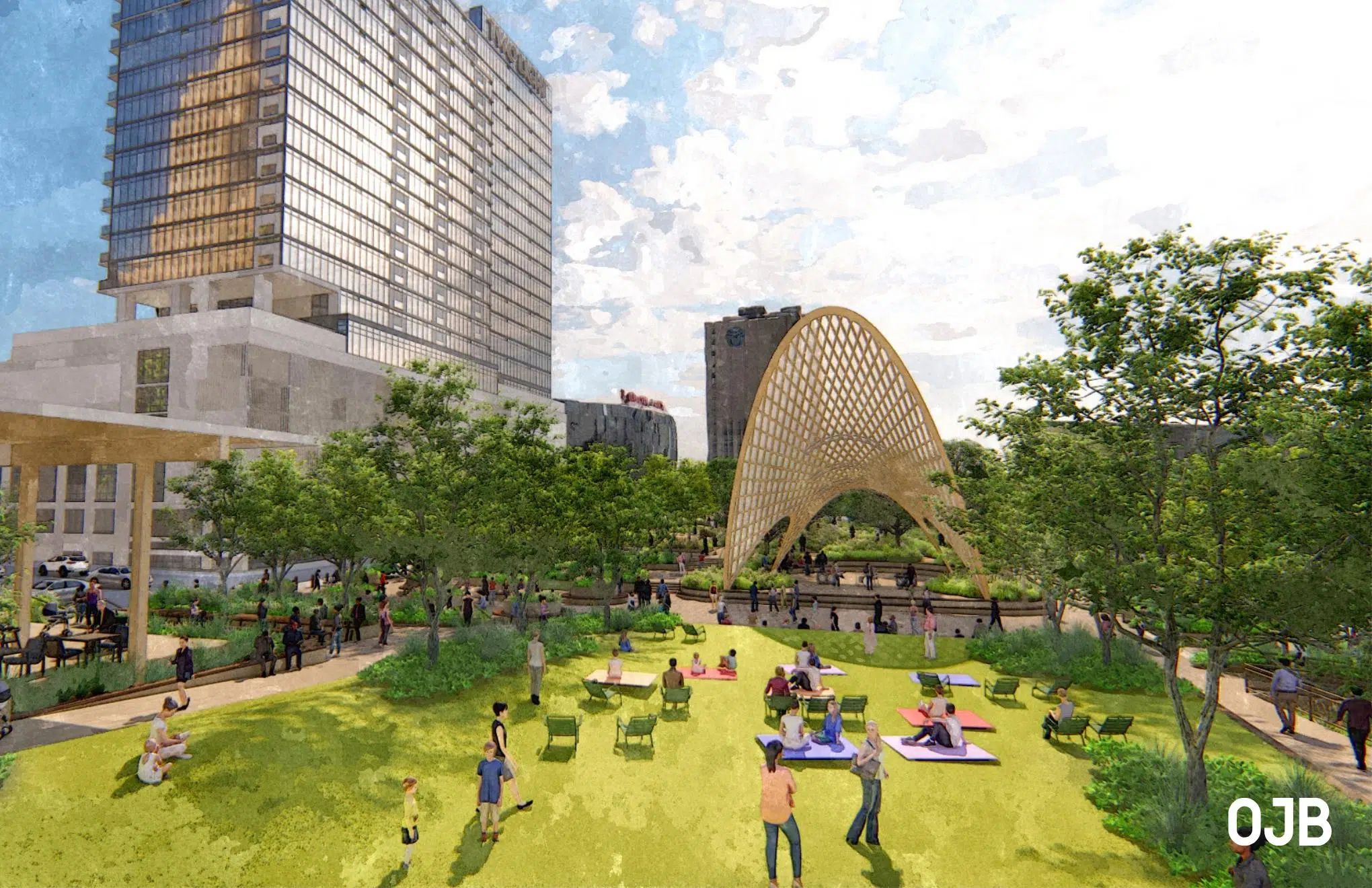 Park & Play: Designed by landscape architecture firm OJB, the park would bridge the Central Business District and the Crossroads Arts District, stretching four blocks between the KC Convention Center and the Power & Light District. Planned amenities include an events lawn, public art, ornamental gardens, a performance pavilion, a dog park, and more. It would resemble Klyde Warren Park in Dallas, TX.