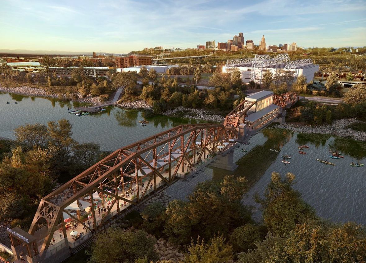 Two States, One Bridge: The Rock Island Bridge will feature 11,000 square feet of entertainment space, a first-floor restaurant called “River House”, various bars, pedestrian trails, and a top-level event space. When complete, people will be able to walk/bike across the bridge year-round, but the entertainment will only be open March through December.