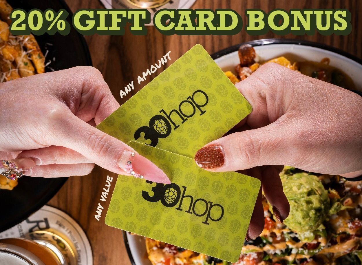 Burgers & Bonuses: 30hop is now offering a 20% bonus on all gift cards now through December 31st. Spend $50, and get $10 bonus. Spend $100, and get a $20 bonus. And so on. Bonuses will be sent to your email and will be ready for use on your next night at 30hop!